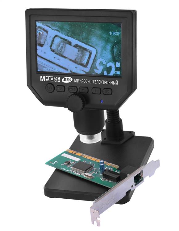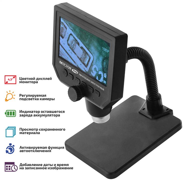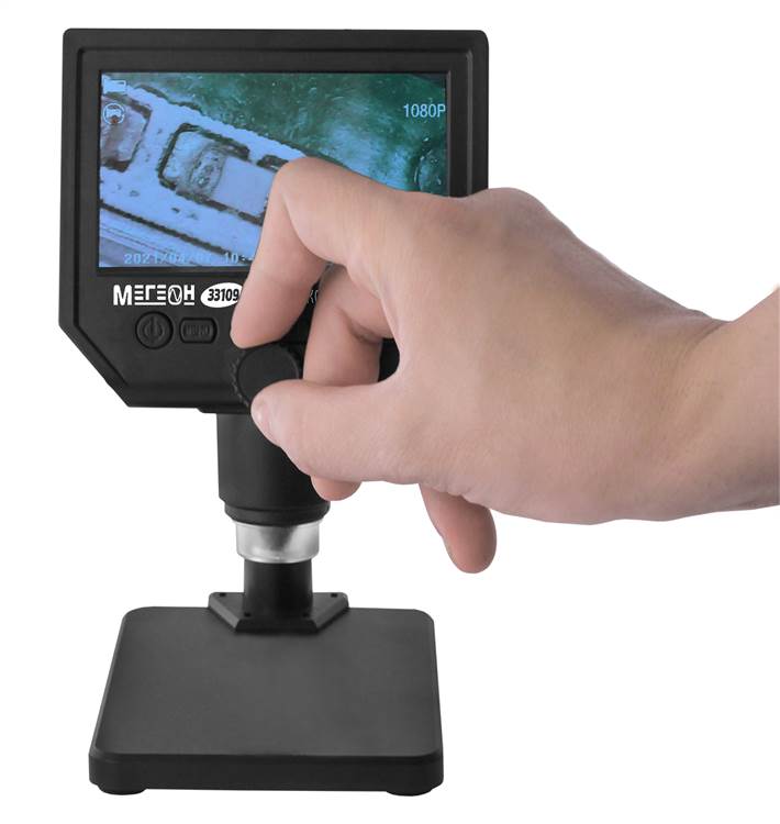 МЕГЕОН 33109 - новинка в модельном ряду цифровых микроскопов. Модель сочетает в себе: эргономичную форму, небольшие размеры, вес и высокие эксплуатационные характеристики. Прибор оборудован аналоговой камерой с яркой регулируемой подсветкой, включающей в себя 8 светодиодов с увеличенным ресурсом. Наличие аккумулятора позволяет использовать автономно в пределах 6 часов без подзарядки. Цветной монитор с дисплеем 4,3’ в высоком качестве отобразит мельчайшие объекты, которые неразличимы невооружённым взглядом. Изделие имеет простой и понятный интерфейс, переведённый на 16 языков, большое количество опций изображения и плавную настройку фокуса. С целью сохранения заряда аккумуляторной батареи предусмотрена функция автоматического выключения и затухания экрана, а также активация при обнаружении движения перед объективом. Прибор найдёт широкое применение в исследованиях, контроле качества на производстве, ювелирном деле, ремонте печатных плат и различной радиоэлектронной аппаратуры.