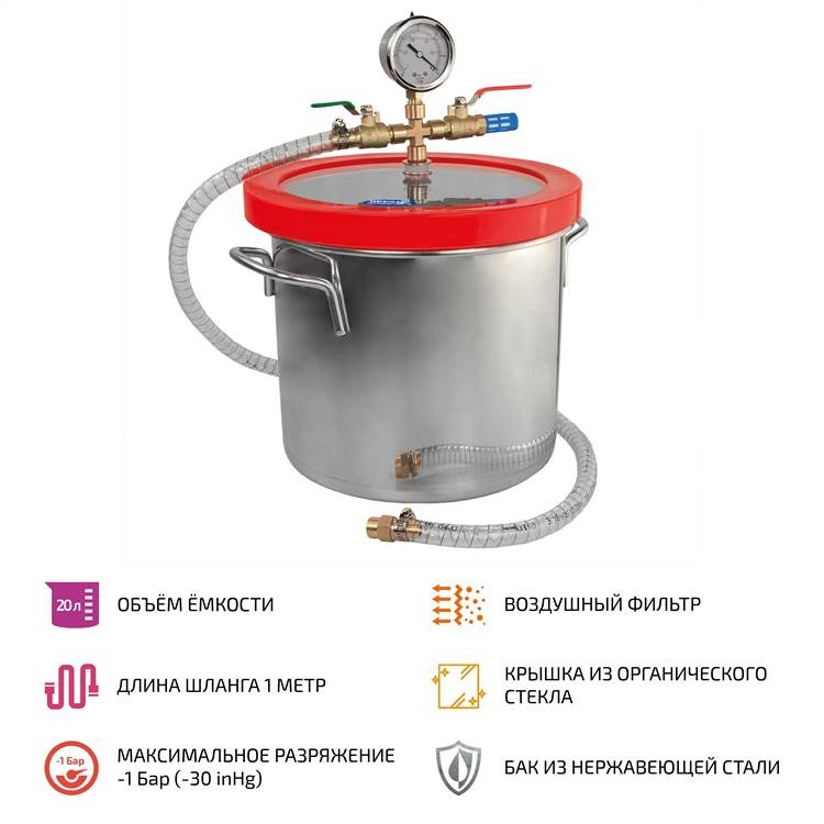 МЕГЕОН 51709 – многоцелевая вакуумная камера объёмом 20 литров, предназначенная для пропитки, стабилизации, окраски, осушения, дегазации, проведения исследований в вакууме и других применений. Ёмкость изготовлена из нержавеющего сплава стенки которой, имеют оптимальную толщину для работы с нагрузкой до -100 кПа. В качестве материала крышки было применено прозрачное органическое стекло толщиной 19 мм. На крышку установлен коллектор с манометром, двумя кранами, фильтром и двухстороннее силиконовое уплотнение. Всасывающий шланг имеет специальную армировку с целью исключить деформацию при нагнетании разряжения. Изделие идеально подойдет для работы совместно с вакуумирующими насосами моделей МЕГЕОН 98031, 98033 и 98036. Оборудование имеет простую и надёжную конструкцию, которую по достоинству смогут оценить любители и профессионалы.