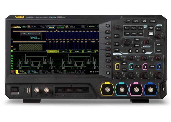 Цифровой осциллограф MSO5354 интегрирует в себе до семи измерительных приборов: цифровой осциллограф, 16-канальный логический анализатор, анализатор спектра, двухканальный генератор сигналов, цифровой вольтметр, 6-разрядный частотомер, анализатор протоколов. Осциллограф MSO5354 использует новейший процессор "Phoenix", разработанный компанией Rigol. Это обеспечивает частоту дискретизации в реальном времени до 8 Гвыб/с, а технология UltraVision 2 позволяет увеличить размер глубины записи до 200 М точек, скорость захвата осциллограмм до 500000 осц/с, а максимальный размер кадров при анализе осциллограмм до 450000. В цифровом осциллографе MSO5354 применен большой сенсорный дисплей, что наряду с традиционными органами управления на передней панели прибора делает пользовательский интерфейс простым и удобным, а также предоставляет возможность использовать зональный триггер.