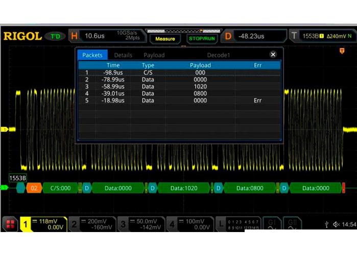 Опция MSO8000-AERO добавляет в осциллографы Rigol серии MSO8000 возможность декодирования и запуска по сигналам шины MIL-STD 1553.