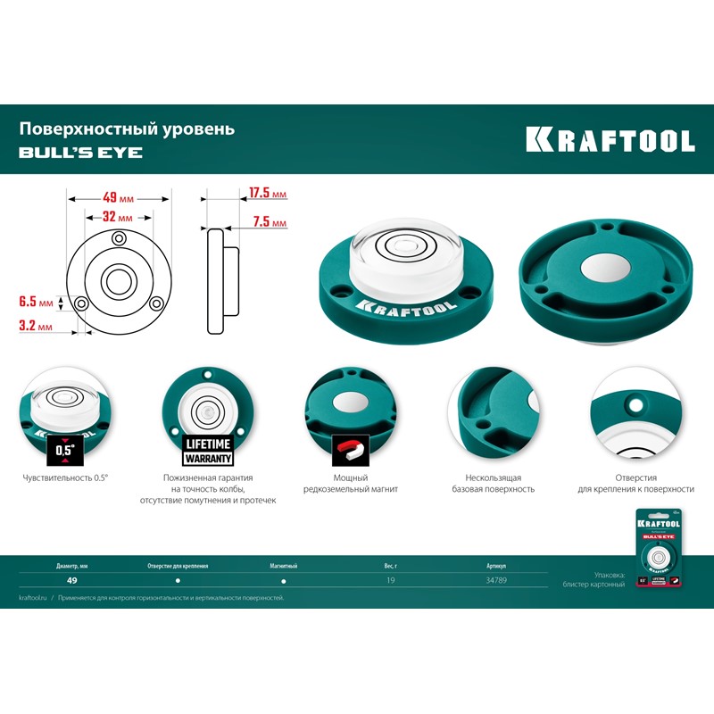 Поверхностный магнитный уровень Kraftool ″Бычий глаз″ Bull's Eye