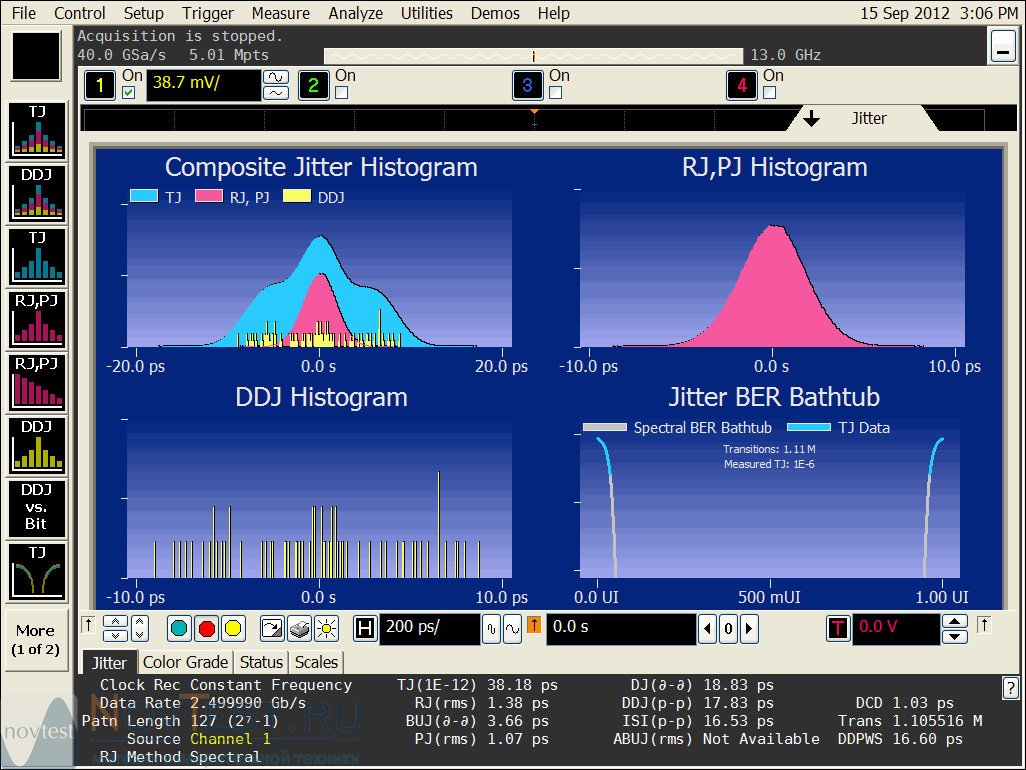 - Комбинированная гистограмма для составляющих джиттера RJ, PJ, DJ, DDJ, DCD и ISI
