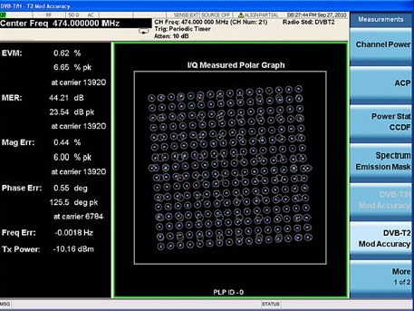 - Измерение погрешности модуляции: сигнальное созвездие, декодирование TPS(DVB-T), сигнализация L1 (DVB-T2), коэффициент ошибок модуляции/модуль вектора ошибки, среднеквадратичное/пиковое значение коэффициента ошибок модуляции, коэффициент ошибок модуляции для поднесущих и данных, коэффициент битовых ошибок, ошибка частоты, ошибка амплитуды, ошибка фазы, фазовый джиттер, квадратурная ошибка, дисбаланс амплитуды, подавление несущей, мониторинг коэффициента ошибок модуляции