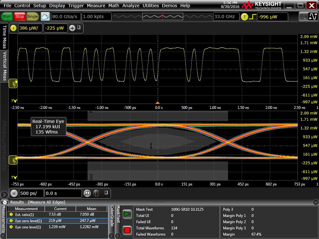 Адаптер обеспечивает полосу пропускания от постоянного тока до 33 ГГц. При использовании с осциллографом Infiniium V-Series или Z-Series 33 ГГц, N7004A позволяет пользователям просматривать оптические потоки со скоростью до 28 Гбит / с, что делает его идеальным решением для определения характеристик или поиска неисправностей высокоскоростных оптических сигналов при тестировании системного уровня. N7004A с осциллографом реального времени Infiniium - идеальное решение для пользователей, которые хотят наблюдать оптические сигналы без фильтрации.