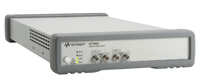 Оптические аттенюаторы используются для гибкого контроля уровня оптических сигналов в процессе тестирования. Основной областью применения оптических аттенюаторов является определение чувствительности оптических приемников путем измерения зависимости коэффициента битовых ошибок от мощности входного сигнала. Оптические аттенюаторы N7766A и N7768A имеют соответственно два или четыре канала, которые могут оснащаться портами, рассчитанными на использование многомодового оптоволокна диаметром 50 мкм, 62,5 мкм или 80 мкм. Для обеспечения точной и стабильной настройки мощности вне зависимости от входной мощности осуществляется непрерывный контроль уровня мощности выходного сигнала. Удобная настройка параметров смещения позволяет устанавливать уровень мощности, соответствующий сигналу после прохождения других оптических компонентов в устройстве.