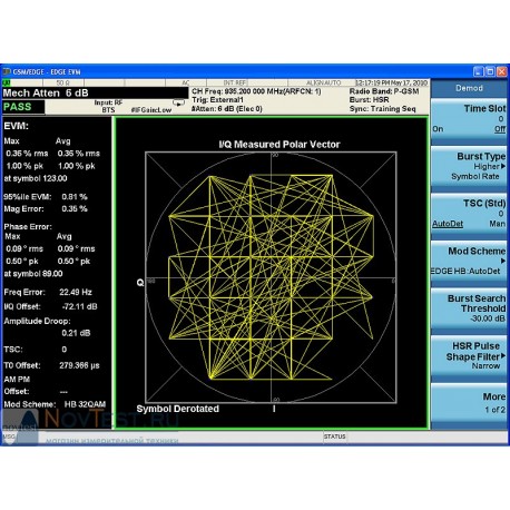 - Выполнение с помощью высокопроизводительного анализатора сигналов PXA ORFS измерений в широком динамическом диапазоне для сигналов с GMSK, QPSK, 8-PSK, 16-QAM и 32-QAM модуляцией, нормальной или высокой скорости передачи символов и фильтров передатчиков импульсов большой длительности
