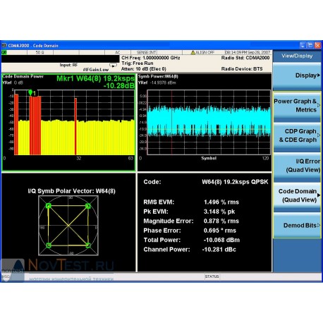 - Возможность сужения сигнала кодового канала до уровня символа с отображением результатов измерения мощности символа и модуля вектора ошибок даже в присутствии нескольких кодовых каналов.