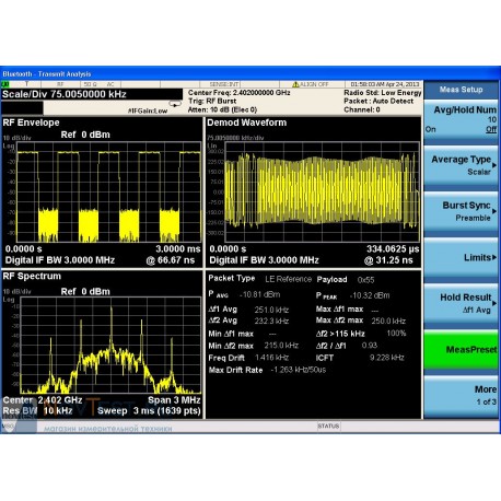 - Анализ суммарной выходной мощности передатчика (Basic Rate или Low Energy) или относительной мощности (EDR) и измерения параметров модуляции, при этом результаты измерений отображаются одновременно