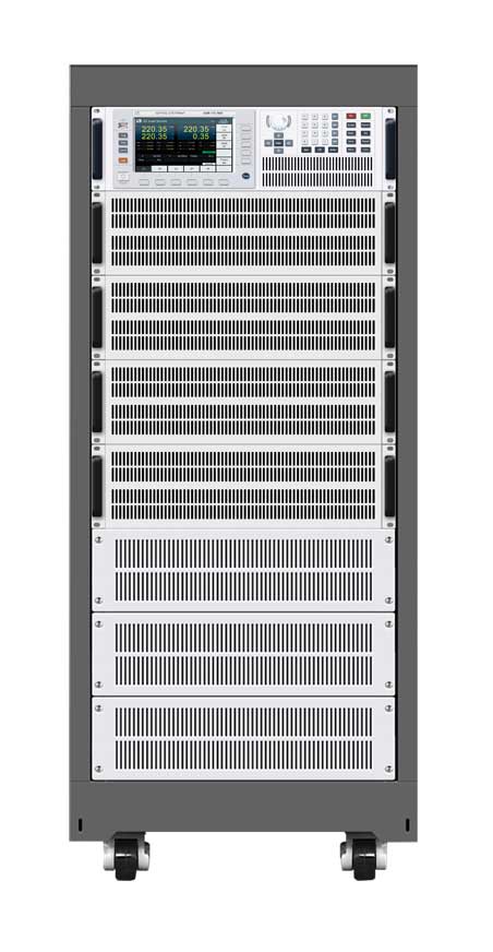 Программируемая электронная нагрузка постоянного и переменного тока. Постоянный/переменный ток до 120 А/ 120 Аскз (360 Апик), постоянное/переменное напряжение 10…600 В/ 50…420 Вскз (360 Впик), диапазон частот 45…450 Гц, мощность до 10,8 кВт. Четыре режима нагрузки: постоянное напряжение (CV), постоянное сопротивление (CR), постоянная мощность (CP) и постоянный ток (СС) с изменяемым коэффициент амплитуды и коэффициент мощности. Режимы защиты: от перегрева (OTP), перегрузки по току (ОСР), по напряжению (OVP), по мощности (OPP) и от пониженного напряжения (UVP). Измерение и одновременная индикация Vrms, Vpk, Vdc, Irms, Ipk, Idc, W, VA, VAR, CF, PF. Внешнее аналоговое управление и мониторинг. 4-проводная схема подключения. Возможность объединения трех моделей для тестирования 3фазных сетей. Цветной ЖК-дисплей с функцией отображения формы сигнала. Интерфейсы: GPIB, USB, LAN. Габариты (ш х в х г): 550 х 1291 х 800 мм. Монтаж в стойку 24U.