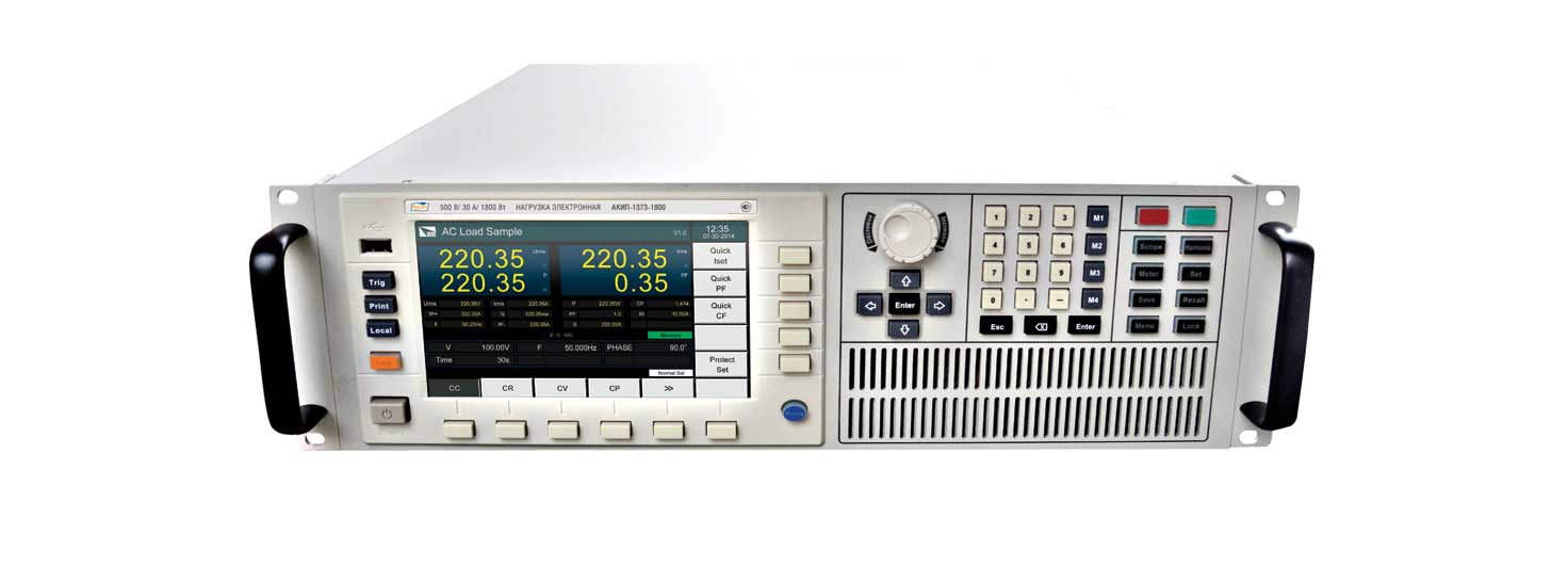 Программируемая электронная нагрузка постоянного и переменного тока. Постоянный/переменный ток до 20 А/ 20 Аскз (60 Апик), постоянное/переменное напряжение 10…360 В/ 15…260 Вскз (360 Впик), диапазон частот 45…450 Гц, мощность до 1800 Вт. Четыре режима нагрузки: постоянное напряжение (CV), постоянное сопротивление (CR), постоянная мощность (CP) и постоянный ток (СС) с изменяемым коэффициент амплитуды и коэффициент мощности. Режимы защиты: от перегрева (OTP), перегрузки по току (ОСР), по напряжению (OVP), по мощности (OPP) и от пониженного напряжения (UVP). Измерение и одновременная индикация Vrms, Vpk, Vdc, Irms, Ipk, Idc, W, VA, VAR, CF, PF. Внешнее аналоговое управление и мониторинг. 4-проводная схема подключения. Возможность объединения трех моделей для тестирования 3фазных сетей. Цветной ЖК-дисплей с функцией отображения формы сигнала. Интерфейсы: GPIB, USB, LAN. Габариты (ш х в х г): 483 х 151 х 600 мм.