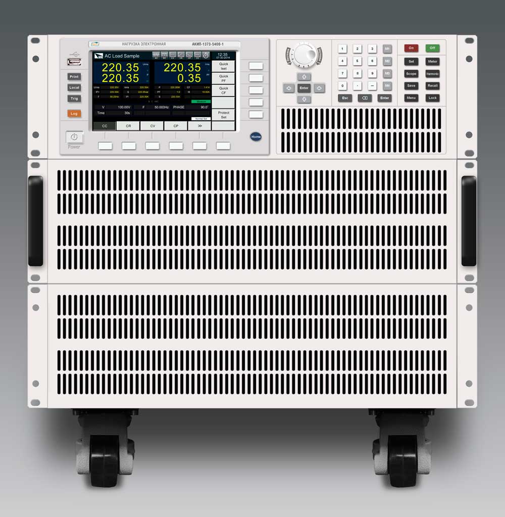 1 фазный или 3-х фазный режимы работы нагрузки (три блока: 1 ведущий + 2 ведомых или 3 ведущих). Параметры нагрузки в 1 фазном режиме. Постоянный/переменный ток до 60 А/ 60 Аскз (180 Апик), постоянное/переменное напряжение 10…600 В/ 50…420 Вскз (360 Впик), диапазон частот 45…450 Гц, мощность до 5400 Вт. Четыре режима нагрузки: постоянное напряжение (CV), постоянное сопротивление (CR), постоянная мощность (CP) и постоянный ток (СС) с изменяемым коэффициентом амплитуды и коэффициентом мощности. Режимы защиты: от перегрева (OTP), перегрузки по току (ОСР), по напряжению (OVP), по мощности (OPP) и от пониженного напряжения (UVP). Измерение и одновременная индикация Vrms, Vpk, Vdc, Irms, Ipk, Idc, W, VA, VAR, CF, PF. Внешнее аналоговое управление и мониторинг. 4-проводная схема подключения. Цветной ЖК-дисплей с функцией отображения формы сигнала. Интерфейсы: GPIB, USB, LAN. Габариты (ш х в х г): 483 х 482 х 641 мм.