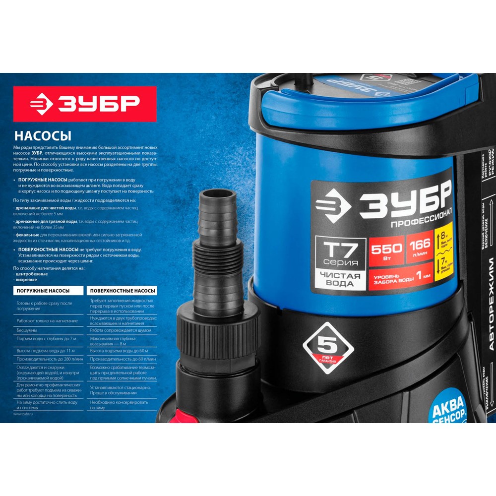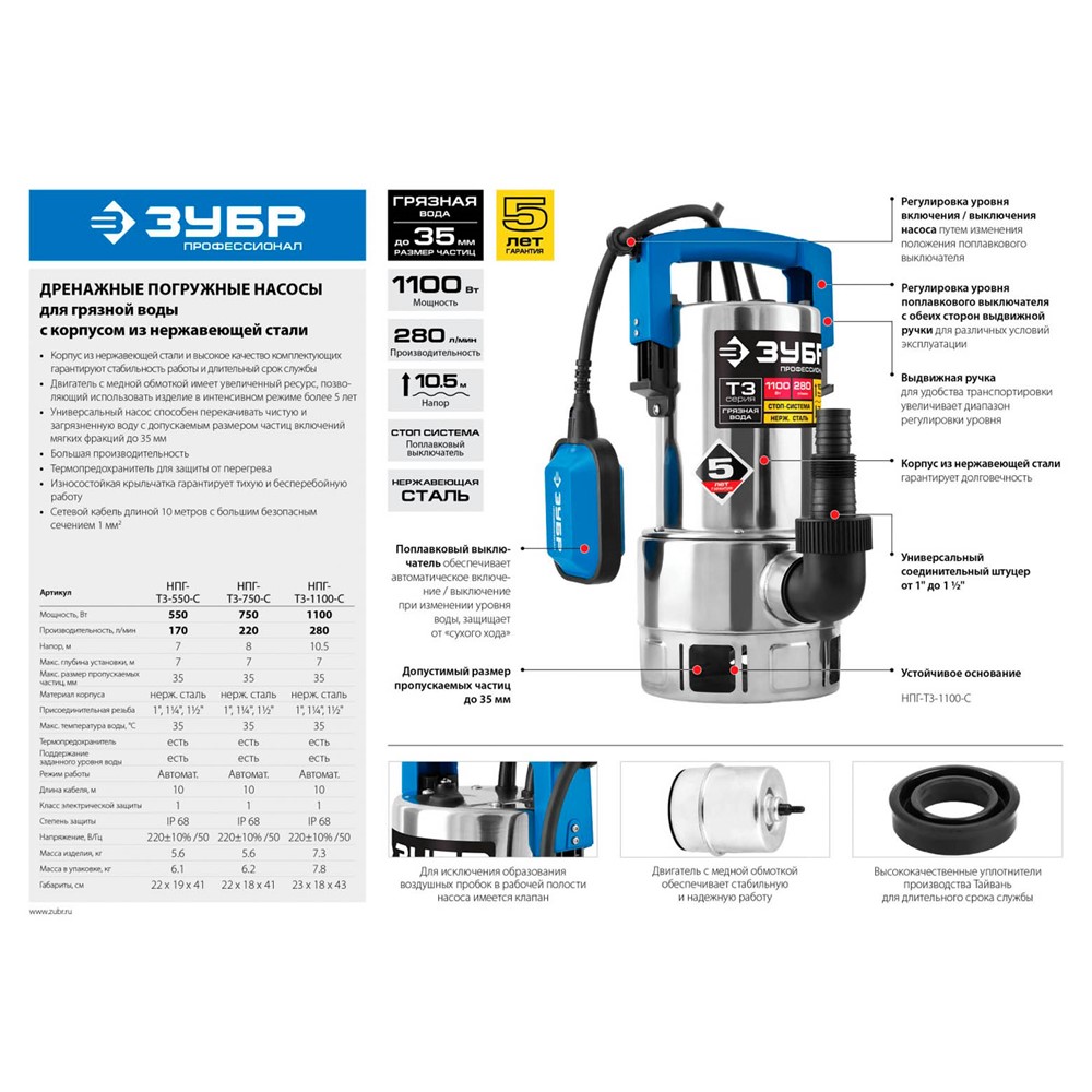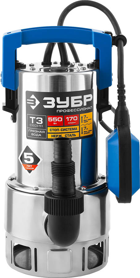 ЗУБР Профессионал НПГ-Т3-550-С, дренажный насос для грязной воды, корпус - нерж. сталь, 550 Вт