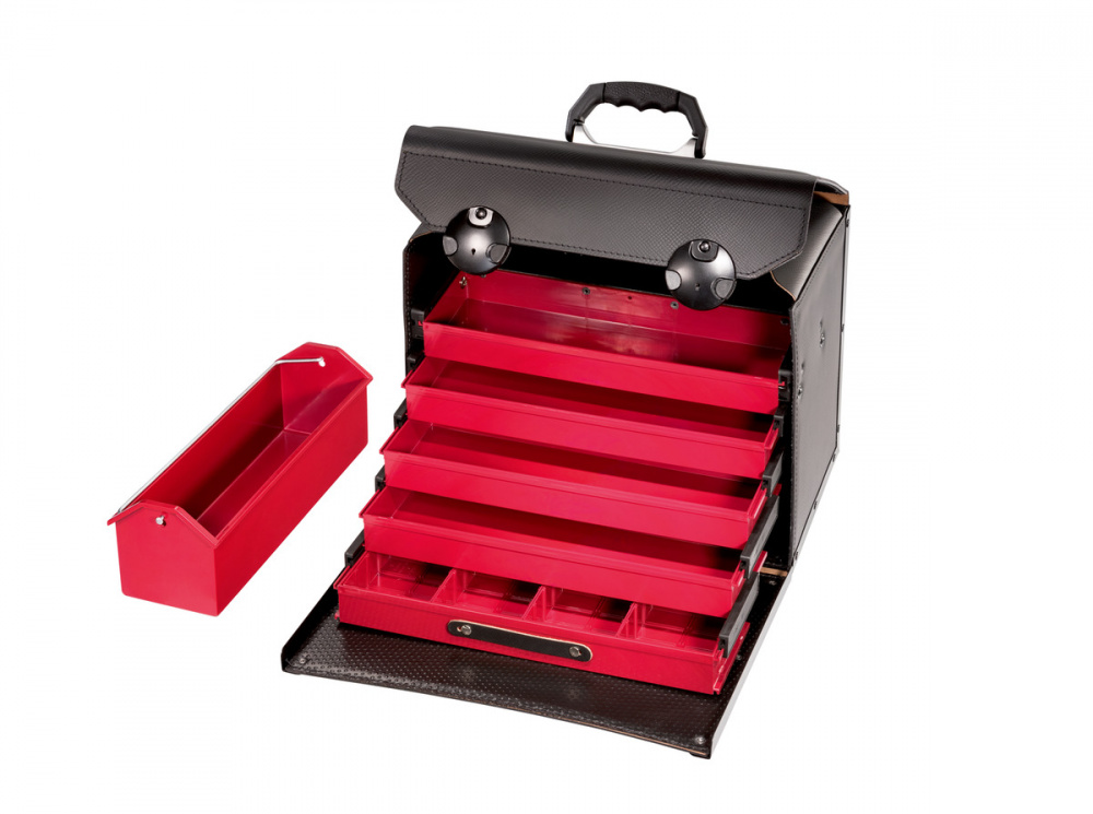 Инструментальная сумка изготовлена из износостойкой кожи, отличается своим большим объёмом примерно 28 л и собственным весом около 4,9 кг, имеет достаточно места для всех важных инструментов. За откидной передней стенкой размещена секция из пяти выдвижных ящиков изготовленых из прочного пластика. Объёмные выдвижные ящики можно использовать для хранения как инструментов, так и мелких деталей, используя удобные отделения. За выдвижными ящиками имеется большое дополнительное отделение шириной 90 мм. Дополнительно на задней стенке сумки установлен держатель инструментов CP-7 на диаметр 15 мм. В этой кожаной инструментальной сумке также предусмотрен прочный переносной ящик для удобного размещения инструментов. Эта сумка снабжена надёжными замками-защёлками. Благодаря эргономичной ручке инструментальную сумку можно переносить с полным комфортом даже при полной загрузке.