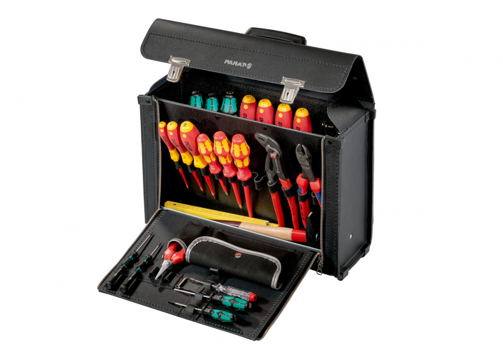 Инструментальная сумка NEW CLASSIC Plus фирмы PARAT отличается использованием добротных материалов и качеством исполнения. Изготовлена из тиснёной яловичной кожи, которая характеризуется влагоотталкивающими свойствами, особой прочностью и долговечностью. Добротная ручка для переноски обеспечивает комфорт в ношении инструментальной сумки. Упоры для защиты днища оберегаю и сумку, и рабочую поверхность от износа и царапин. На откидной передней стенке инструментальной сумки аккуратно содержатся рабочие материалы, которые всегда нужны под рукой. Она имеет 8 петель-держателей с регулировкой. В отдельном кармане находятся предметы, которые должны быть быстро и легко доступны. Дополнительно на передней стенке имеется фиксируемое отделение для мелких деталей. Съёмная перегородка имеет 11 петель-держателей и открытый карман. Задняя стенка инструментальной сумки имеет 9 фиксированных петель-держателей для дополнительных инструментов. Днище сумки внутри усилено оцинкованной жестью, что придаёт дополнительную жёсткость и защищает рабочие материалы. Инструментальную сумку можно закрыть на удобные замки с фиксатором. NEW CLASSIC Plus вмещает всего 29 инструментов, другое оборудование, например, молоток, уровень или т.п. крепится к низу инструментальной сумки.