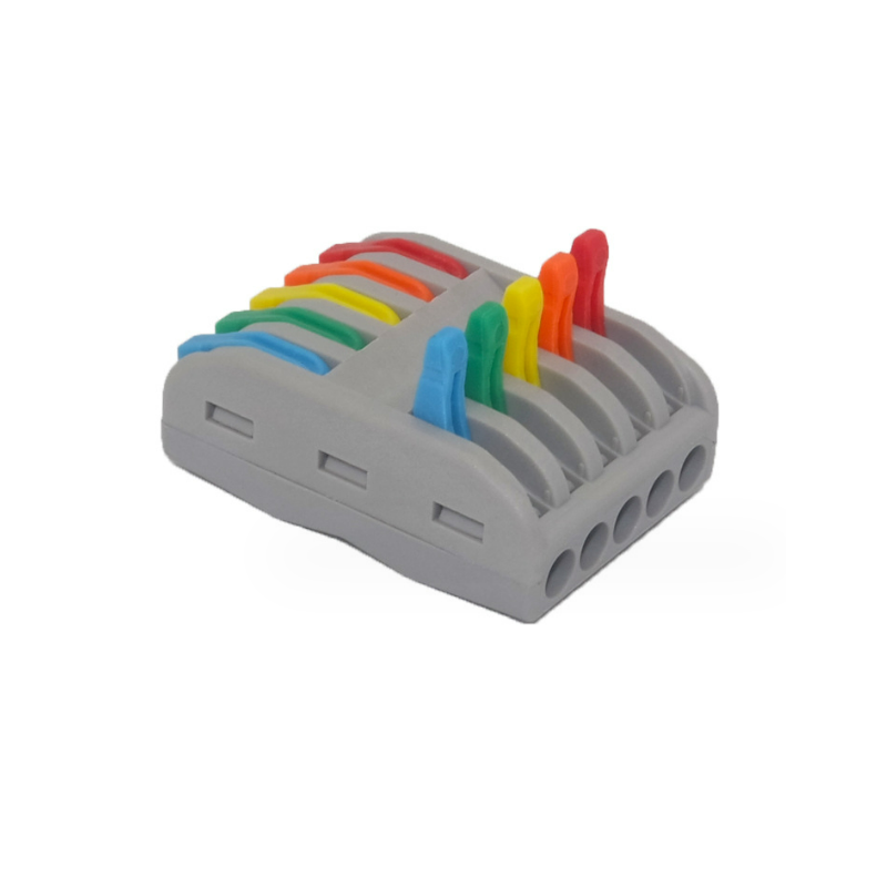 Клеммник 5 конт. (красные/орнажев./желтые/зелен./синие клавиши) зажимной электромонт. проходной, пров. 0.2 - 2.5 кв.мм, до 250В/32А, серый изол. PA6, от - 40 до + 105 гр.C