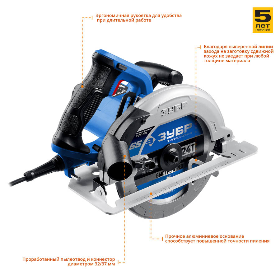 Циркулярная пила ЗУБР ПДП-65, предназначена для выполнения распиловочных работ по дереву и иным материалам (при установке соответствующего диска) под различными углами, а также под наклоном. Прочное алюминиевое основание гарантирует жесткость конструкции и высокую точность реза. Всегда видимые индикаторы линии реза под углами 90 и 45 градусов помогают пилить точно по разметке. Бесступенчатая регулировка глубины и угла пиления с удобными шкалами для точных работ. Простая замена диска благодаря рычажковой блокировке шпинделя. Наглядные и удобно расположенные шкалы угла наклона и глубины. Патрубок для подключения пылесоса для эффективного пылеотвода. Легко скользящий защитный кожух предохраняет оператора от травм. Дополнительная рукоятка под естественный хват обеспечивает удобство и полный контроль во время работы. Удобный встроеный держатель ключа позволяет не потерять его при работе и хранении. Быстрый доступ к щеткам.