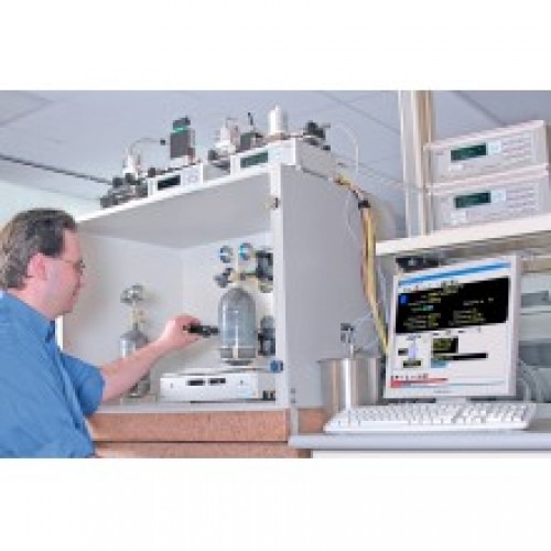 ушедшего газа, а также времени, в течение которого она работала. Для повышения тепловой устойчивости и смягчения вибраций весы помещаются на большую гранитную плиту и окружаются корпусом для понижения давления. В этой системе эталонный газ подается из баллона под давлением, помещенного на весы, масса которого измеряется непрерывно с целью определения количества и скорости уменьшения массы во время испытания. Время, в течение которого это происходит, измеряется высокоскоростным счетчиком/таймером USB, подключенным к контроллеру системы. В этой системе могут использоваться различные коррозионно-стойкие газообразные вещества – просто путем откачивания эталонного газа из баллона и нагнетания выбранного материала.