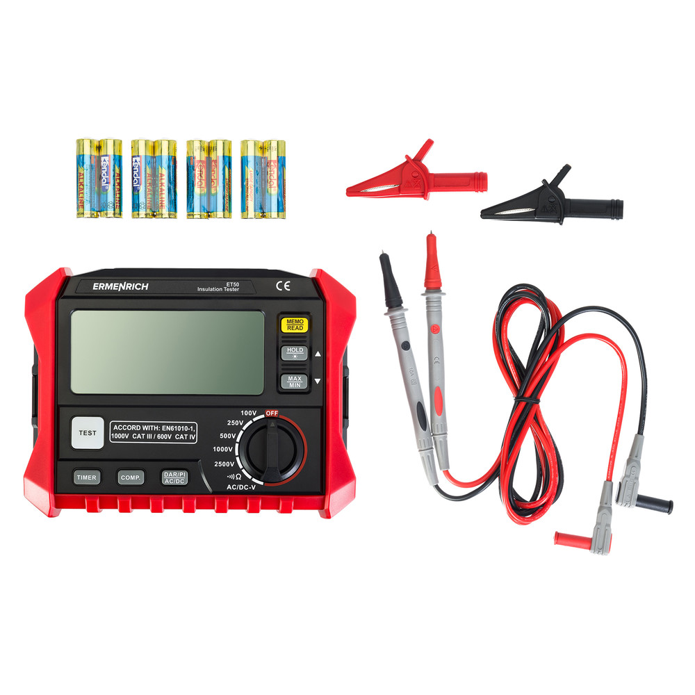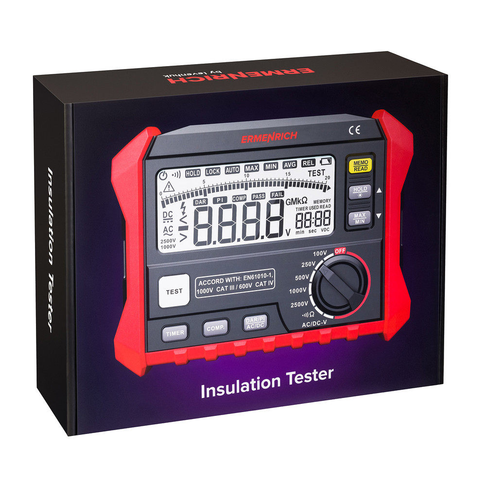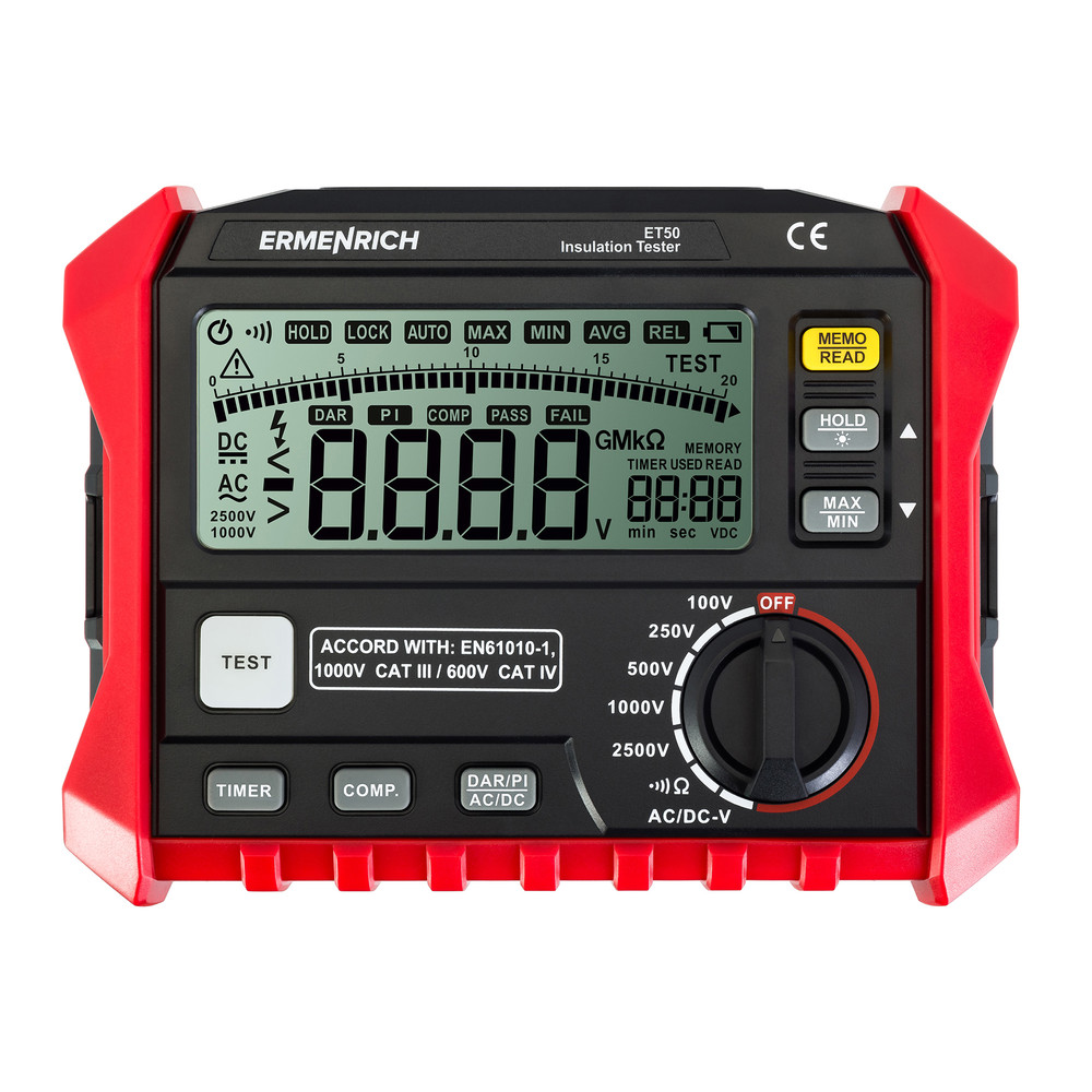 Ermenrich Ping ET50 – мегаомметр (измеритель сопротивления изоляции) с 5 тестовыми напряжениями и верхним пределом измерения 200 ГОм. Предназначен для определения влажности изоляции (коэффициент абсорбции, DAR) и остаточного ресурса (индекс поляризации, PI). Периодические измерения этих параметров позволяют вовремя выявить кабели с поврежденной изоляцией, выполнить просушку или замену и предотвратить короткие замыкания и возгорания в электросетях.