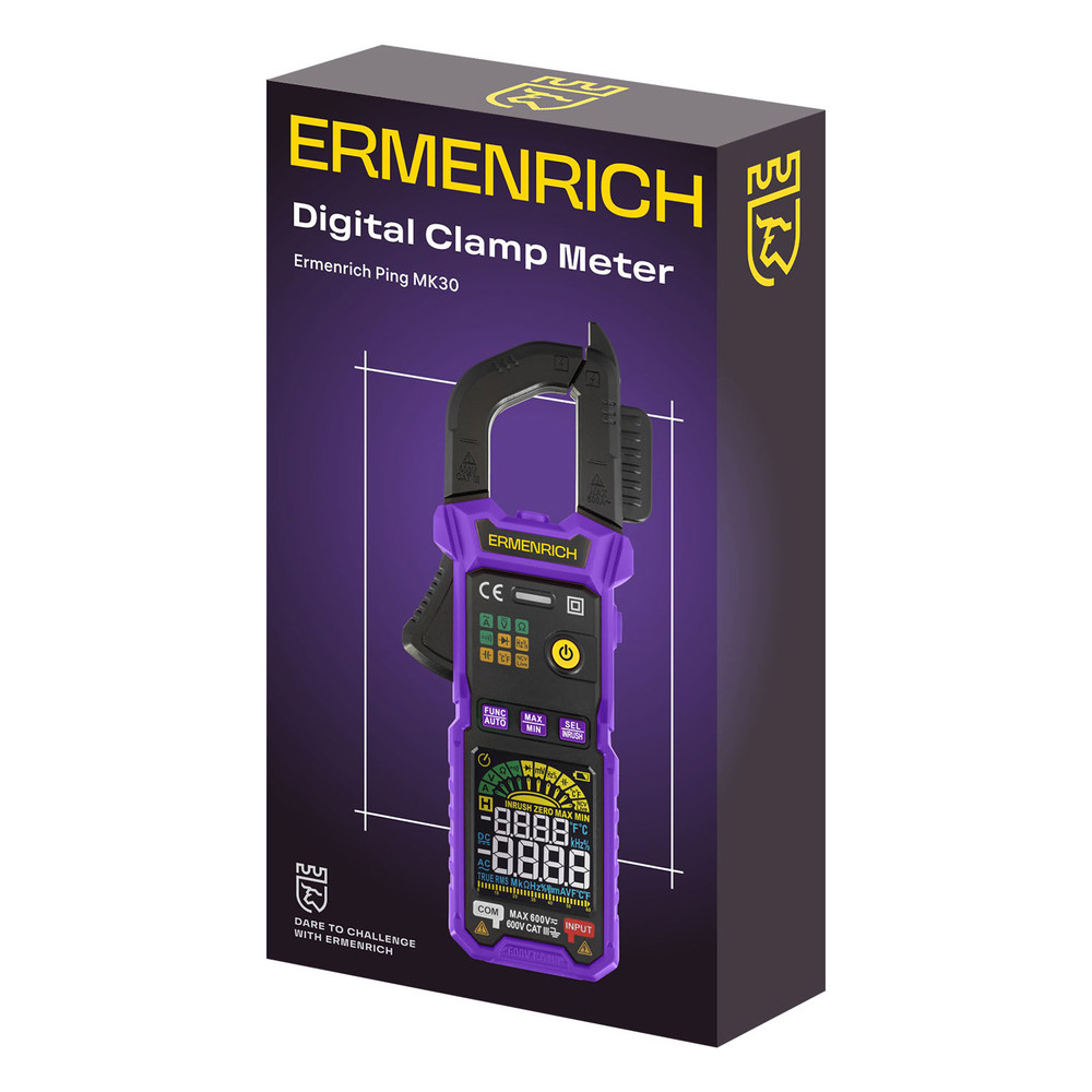 Ermenrich Ping MK30 – многофункциональный измеритель (токовые клещи) для определения силы тока, напряжения, сопротивления, частоты, емкости и рабочего цикла. Измерение тока осуществляется без размыкания электрической цепи, что гораздо удобнее, чем при использовании обычного амперметра. Клещи также имеют функции прозвонки кабелей для поиска обрывов и коротких замыканий, проверки рабочего состояния диодов, бесконтактного определения напряжения (поиска скрытых проводов) и фазы. Благодаря термопаре можно измерять температуру с выбором единицы измерения (°C или °F).