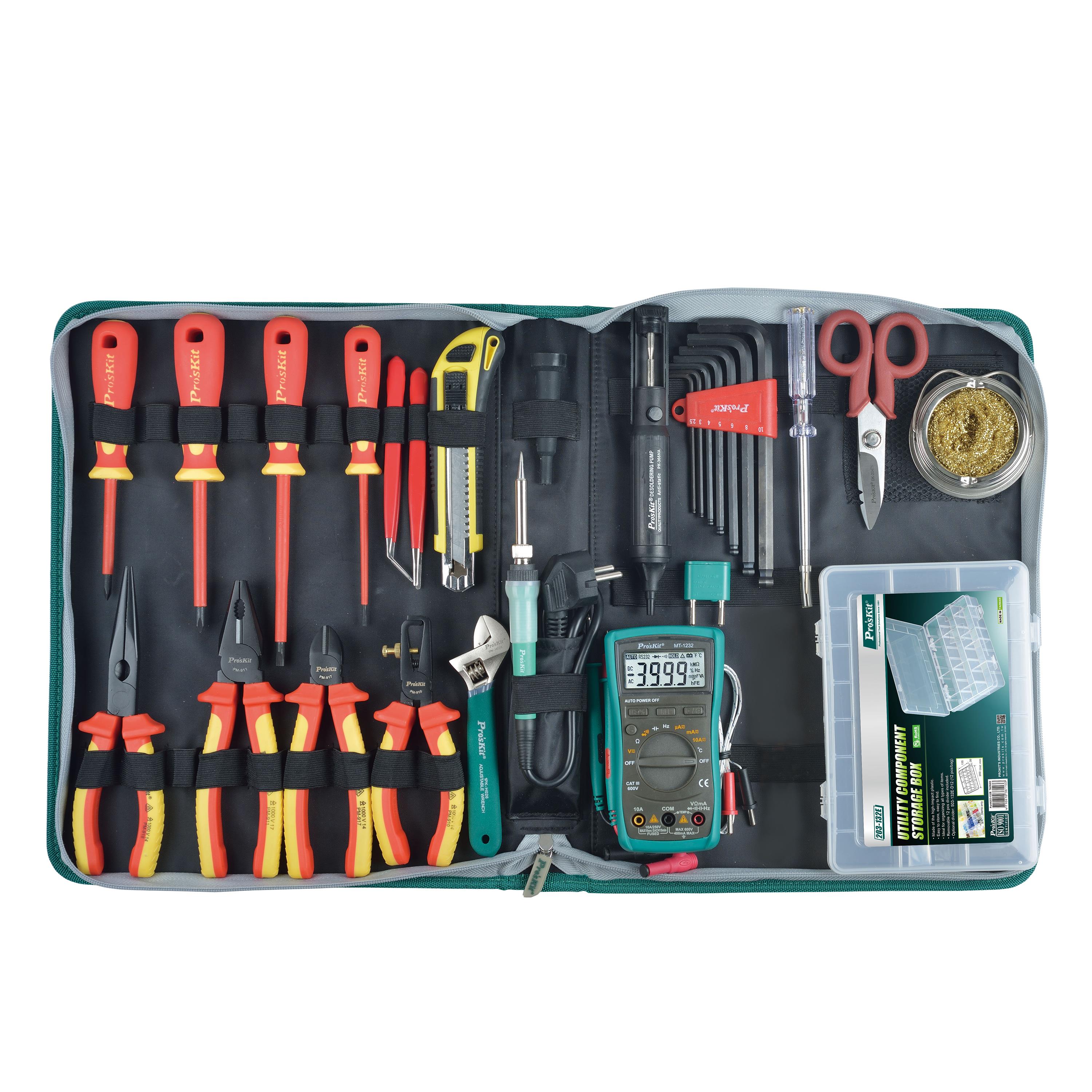 The 1000V insulated tool kit is a complete tool kit for electronical maintenance job. The pliers and screwdrivers complied with IEC 60900:2004, VDE, and DIN 1000V safety standards and bear the GS design. Also, including meter, soldering iron, and more in a durable carrying tool bag