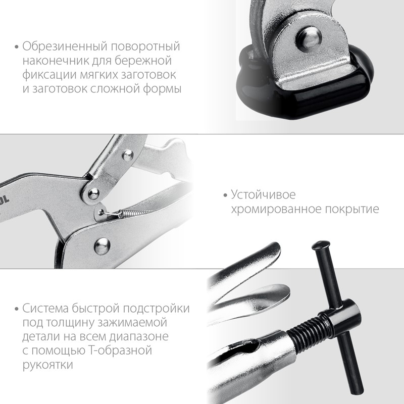 - Обрезиненный наконечник для бережной фиксации мягких заготовок.