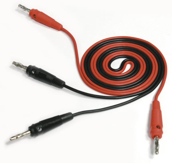 Измерительный кабель PTL904-3, наконечник типа "банан", диаметр наконечника 4 мм, максимальная сила тока 20 А, сквозное перпендикулярное ответвительное гнездо для параллельного соединения, длина наконечника 17 мм, длина изолированной части разъема 37 мм, сечение проводника 1 мм², общая длина 104,5 см, цвета: черный, красный