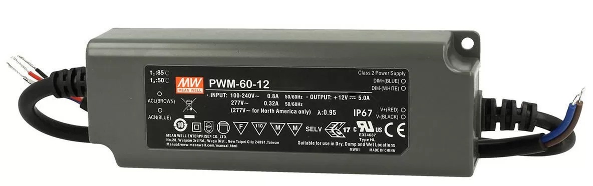 PWM-60 представляет собой драйвер мощностью 60 Вт для светодиодов переменного/постоянного тока, работающий в режиме постоянного напряжения с выходом PWM, который способен поддерживать однородность яркости при управлении всеми видами светодиодных лент.