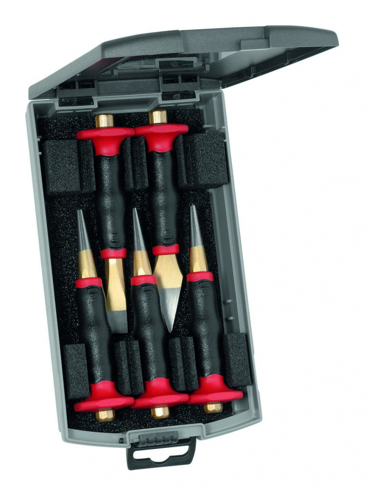 Набор инструментов в пластиковой кассете, восьмигранные, режущая кромка полированная, безопасная ударная головка, специальная инструментальная сталь, кованая, закалённая, окрашенная, содержимое: 2x зубило плоское, 1x крейцмейсель, 2x пробойник, 1x кернер. Сделано в Германии.