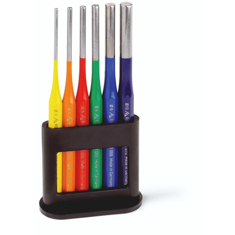 Exclusive Набор выколоток DIN 6450, 6 пр., Ø 3 / 4 / 5 / 6 / 8 / 10 мм, инструментальная сталь, ≥ 58 HRC, разноцветные, пластиковая подставка