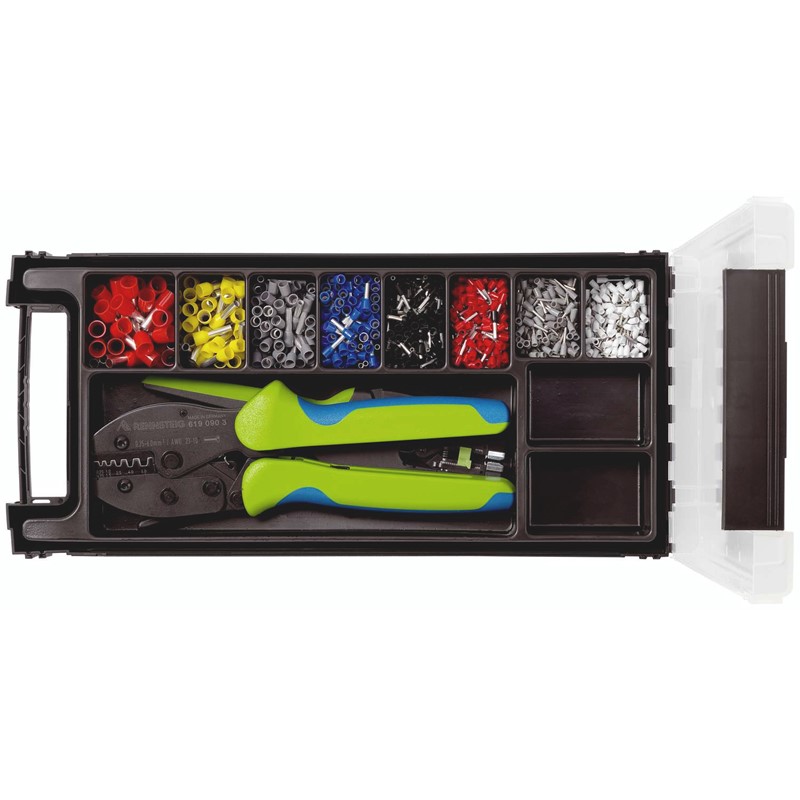 - Пластиковый органайзер с прозрачной крышкой, включающий в себя: Стриппер MultiStrip®, обжимные клещи для концевых гильз, изолированные концевые гильзы