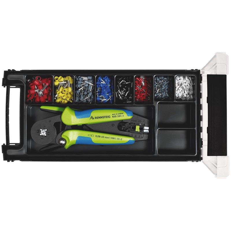 - Пластиковый органайзер с прозрачной крышкой, включающий в себя: Стриппер MultiStrip®, обжимные клещи для концевых гильз, изолированные концевые гильзы
