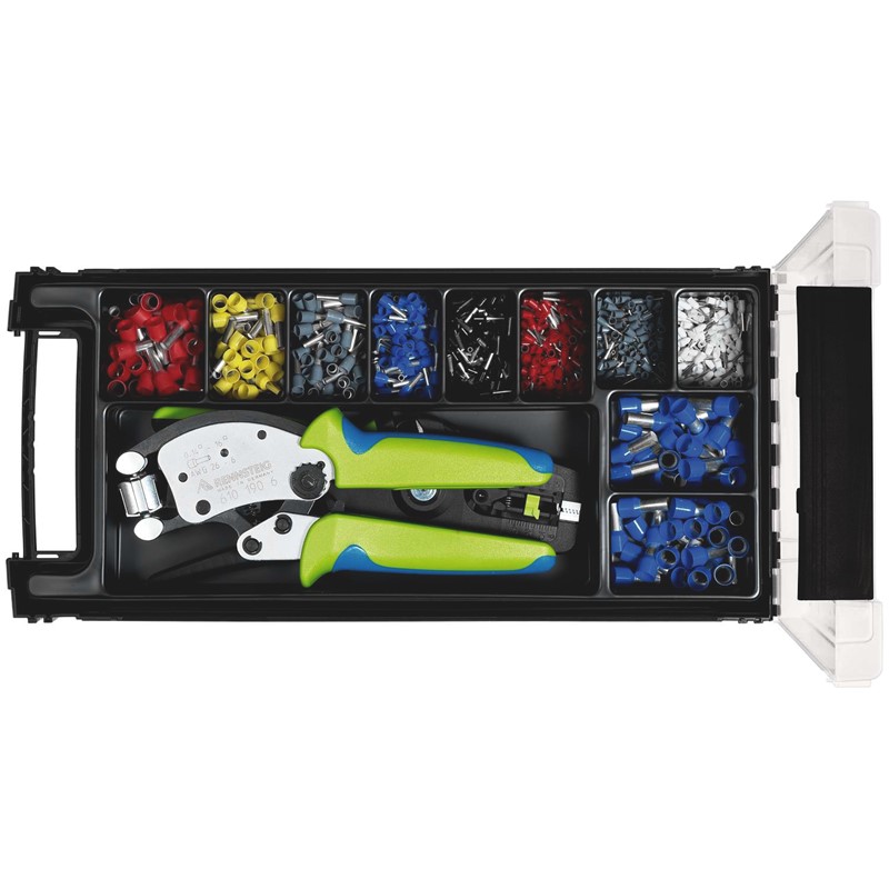 - Пластиковый органайзер с прозрачной крышкой, включающий в себя: Стриппер MultiStrip®, обжимные клещи для концевых гильз, изолированные концевые гильзы