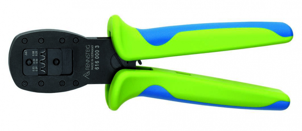 Действительно универсальный инструмент благодаря легко сменяемым опрессовочным плашкам и приёмникам контактов, параллельное движение губок, предпочтительно для соединителей малых размеров в диапазоне опрессовки 0,03-2,5 мм², AWG 32-14, малые размеры и компактная форма, F-образная опрессовка, приёмник для точного размещения контактов, принудительная блокировка (с разблокировкой) для надёжной опрессовки, благодаря оптимальному действию рычагов требуются незначительные мышечные усилия, эргономичные и нескользящие 2К ручки, опрессовочная плашка и приёмник для контактов под HD 22 соединитель 0,14-0,2 мм² и 0,25-0,32 мм². Сделано в Германии.