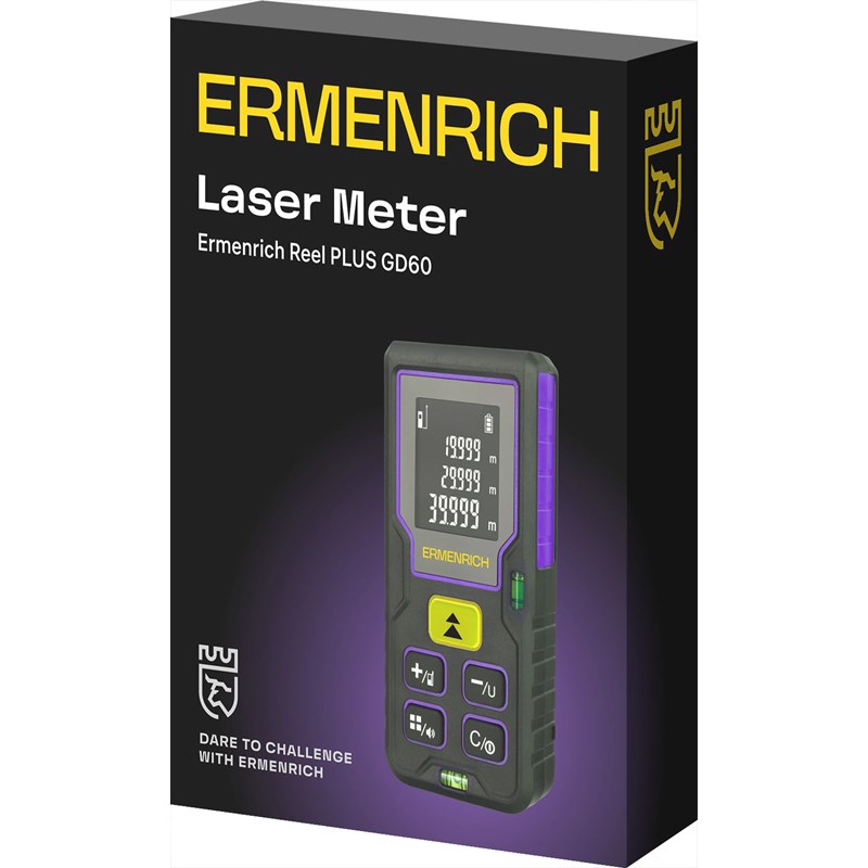 Ermenrich Reel PLUS GD60 – лазерная рулетка, рассчитанная на широкий спектр работ в строительстве, ремонте, на производстве и в кадастровом деле. Рулетку можно использовать для выяснения точных линейных размеров помещений и деталей, а также их площадей и объемов. Память устройства одновременно сохраняет до 20 групп данных. Для отображения результатов измерений и расчетов прибор снабжен ЖК-экраном с 3 отображаемыми строками. Также рулетка поддерживает функцию расчета параметров на основе данных промежуточных замеров, известную как функция «Пифагор».