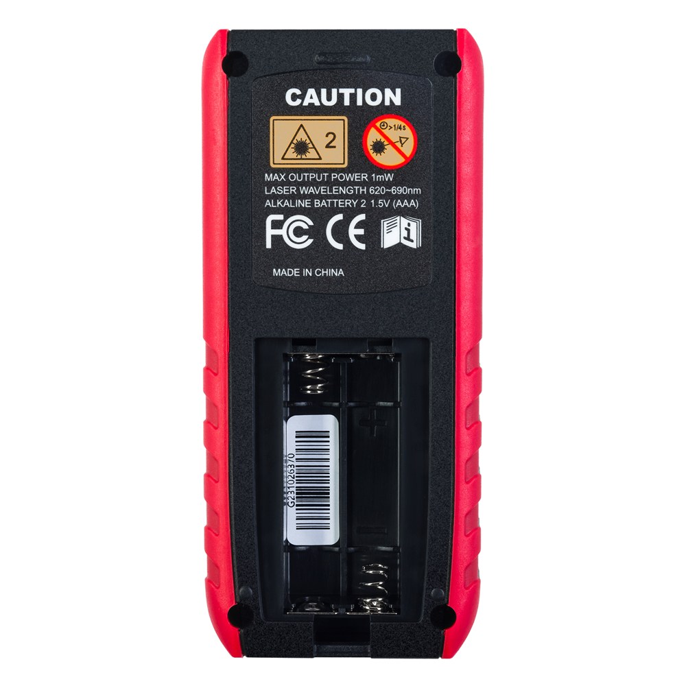 Рабочий диапазон от 5 см до 100 м; погрешность ±2 мм; лазер красного цвета