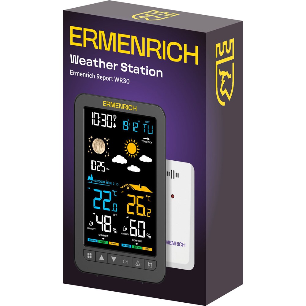 Метеостанция Ermenrich Report WR30 – домашний прибор для контроля наиболее важных в повседневной жизни атмосферных показателей: температуры, влажности воздуха, атмосферного давления. Он имеет широкие диапазоны измерения, высокую точность работы и подходит для использования во всех регионах – от холодных и влажных до жарких и сухих. Благодаря наличию встроенных часов, будильника и календаря метеостанция может заменить собой стандартные цифровые часы, которые можно разместить на любой удобной поверхности – столе или стене.