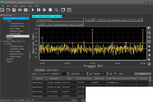 Используя S1210 EMI Pre-compliance Software совместно с анализатором спектра RIGOL можно выполнять тестирование электромагнитного излучения. С их помощью можно измерить амплитуду помех от силового кабеля, используя эквивалент сети (LISN), и выполнить автоматическую коррекцию амплитуды, загрузив корректирующий фактор (предварительный усилитель, аттенюатор, антенна, кабель или массив коррекции).