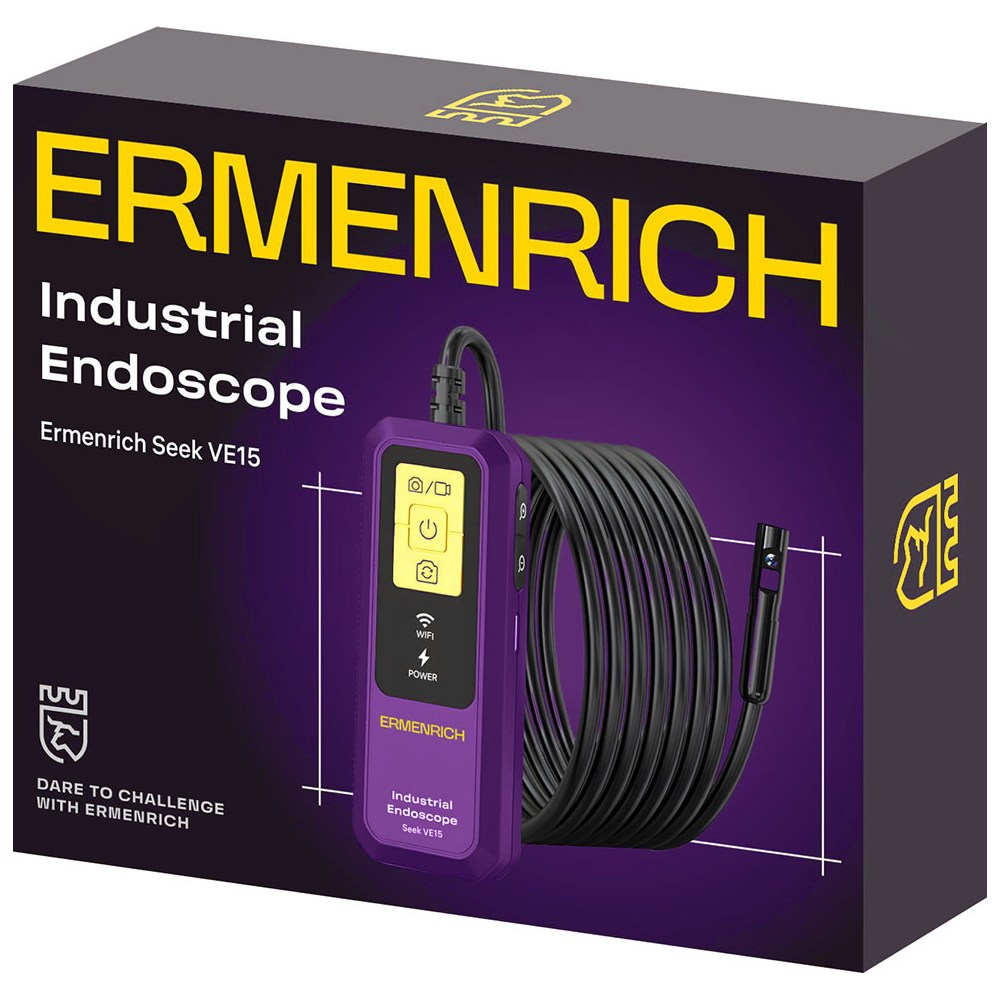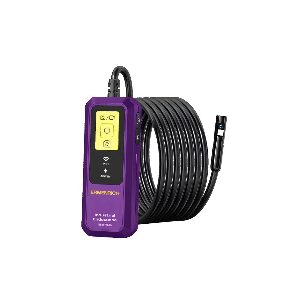 Видеоэндоскоп Ermenrich Seek VE15 – цифровой промышленный инструмент, который используется для проверки скрытых коммуникаций, технических полостей в стенах и шахт вентиляций при оценке качества строительных работ и ремонта и поиске очагов плесени, влажности и промерзания. Его кабель, являющийся частью рабочего зонда, имеет длину 10 метров и отличается гибкостью. На конце кабеля расположены две камеры – фронтальная и боковая. Фронтальная камера имеет угол обзора 70°, вокруг нее собраны 8 светодиодов для дополнительной подсветки в темных местах. Боковая камера имеет угол обзора 78° и 1 светодиод. Фокусное расстояние фронтальной камеры составляет 20−100 мм, боковой − 20−50 мм. За формирование изображения в устройстве отвечает качественный CMOS-сенсор.