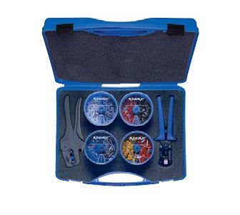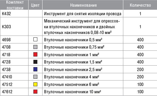 Набор изолированных втулочных наконечников в пластиковом боксе 0,5–10 мм по стандарту DIN 46228, часть 4, с инструментом для снятия изоляции провода K 43/2 и инструментом для опрессовки K 30/3.