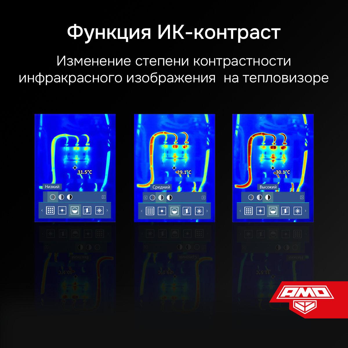 Прибор поддерживает различные палитры отображения: "Железо", "Радуга", "Холод-тепло" и другие, что позволяет визуально выделять зоны с аномальной температурой. Пользователь может настроить контрастность инфракрасного изображения (функция ИК-контраст), чтобы лучше различать нюансы. Режимы отображения можно переключать в реальном времени, что удобно при сравнении различных участков объекта.