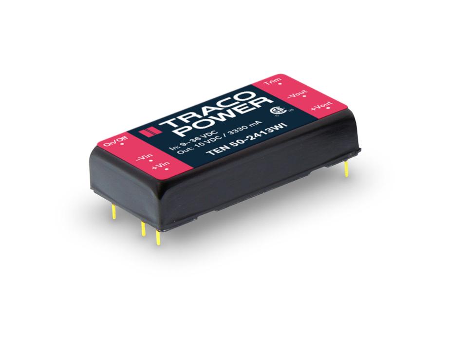 The TEN 50WI Series is a range of isolated high performance DC/DC converter modules. With a very high efficiency of up to 92% and the use of highest reliable components these 50 W converters can be packed into the standard 1.0” x 2.0” casing. The 10 models have a wide 4:1 input voltage range and a tight output voltage regulation. They do not need a minimum load and offer a high efficiency also at low load conditions. The output voltage is adjustable by external resistor. Remote On/Off and protection against overload and short circuit are standard features of these converters. Typical applications are in mobile equipment, instrumentation, distributed power architectures in communication and industrial electronics and everywhere where space on the PCB is critical.