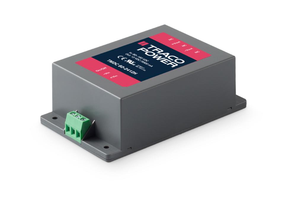 The TMDC 60H series complements Traco Power’s successful TMDC line of Industrial DC/DC off-board modules. All models provide a high 2:1 input voltage range from 80-160 VDC and a reinforced 3000 VAC isolation voltage as well as fully regulated outputs. Internal filters limit conducted and radiated emissions (EN 55032 class A) but also increase the modules EMC immunity (EN 55035). The modules come in fully encapsulated plastic packages and feature a high temperature range from –40° up to 75°C without derating. Latest IT safety certifications (UL 62368-1) and DC-OK and remote on/off functions complete the package to provide an ideal solution for many harsh industrial and 110 VDC battery applications in need of a reinforced isolation to provide a safe SELV output.