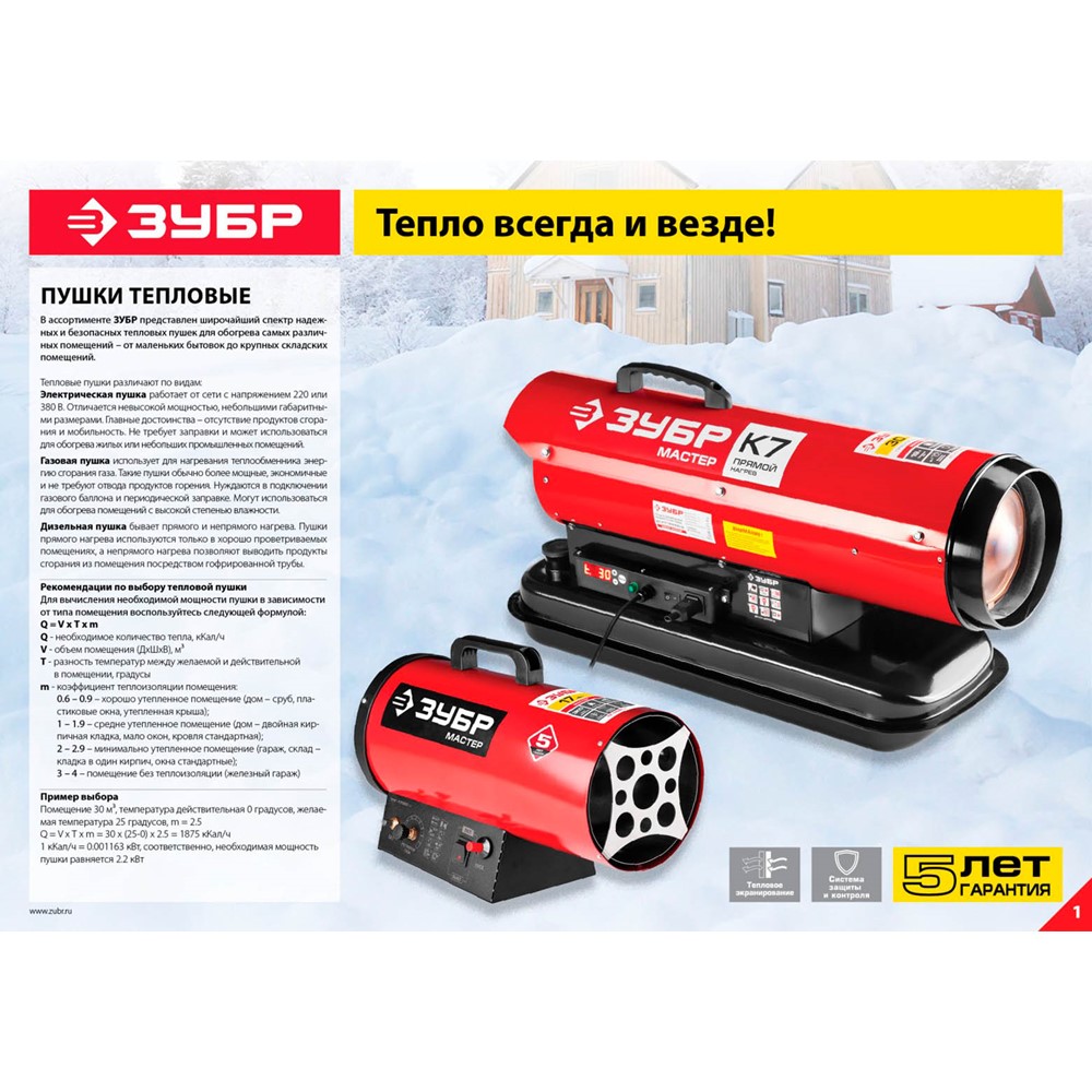 Газовая тепловая пушка ЗУБР ТПГ-17000_М2, предназначена для обогрева и сушки складских и производственных помещений большой площади, а так же идеально подходит для установки натяжных потолков. Высокая тепловая мощность благодаря энергоемкому рабочему телу (газ), высокий уровень КПД, близкий к 100%, низкое энергопотребление. Мощный двигатель вентилятора способствует увеличению теплоотдачи за счет большого объема прокачиваемого воздуха. Регулировка подачи газа позволяет установить оптимальную температуру в помещении. Зажигание от пьезоэлемента обеспечивает надежный поджиг при минимальных потерях газа. Цилиндрическая форма корпуса оптимальна для равномерности воздушного потока. Автоматическое прекращение подачи газа при исчерпании запасов топлива, в случае погасания пламени, при перегреве, а также при отключении электропитания. Дополнительный защитный кожух по всей поверхности камеры сгорания в качестве экрана предотвращает повышенный нагрев корпуса.