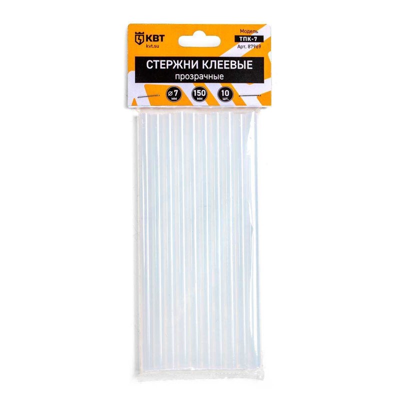| Краткая характеристика | • Диаметр стержня: 7 мм • Длина стрежня: 150 мм • Количество в наборе: 10 шт. • Время схватывания: 15–20 сек. • Точка размягчения: 80 °С • Рабочая температура: 120–160 °С • Изготовлены из высококачественного, бездымного, экологически чистого полиолефина EVA (этиленвинилацетат) • Совместимость: клеевые пистолеты КП-20-7, КП-40-7 |