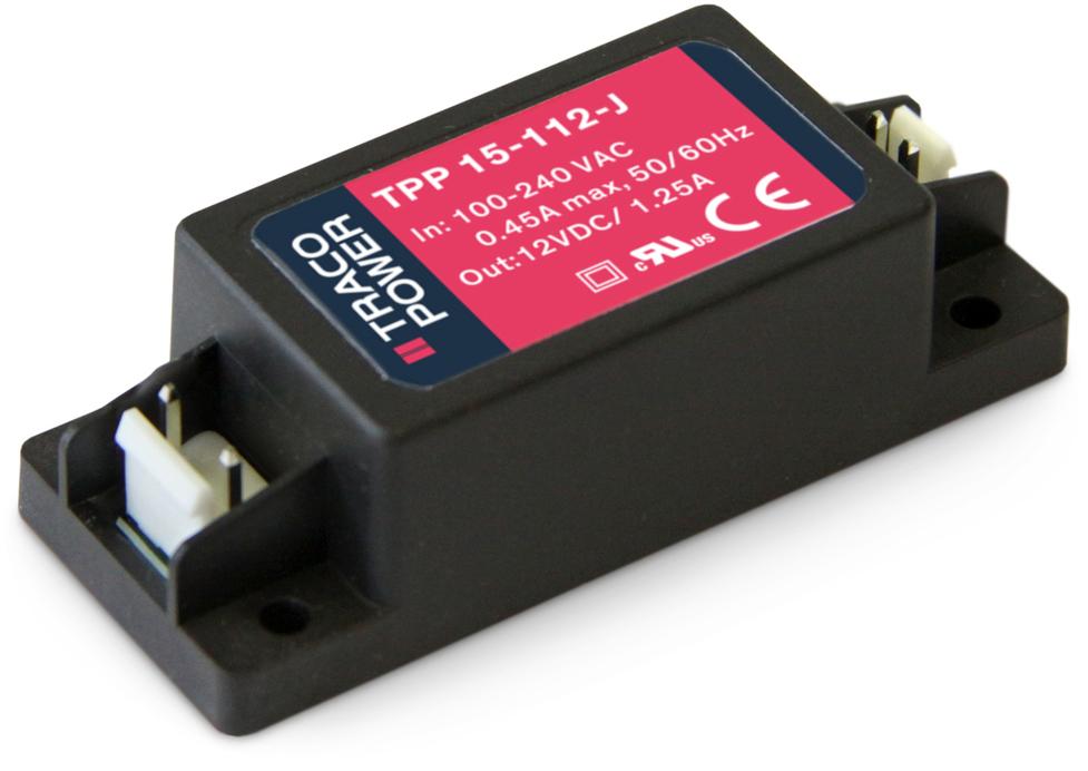 | TPP 15-112-J | 15 W | 85-264 VAC / 120-370 VDC | 12 VDC | 15 Watt AC/DC power supply, medical/industrial/household, 85-264 VAC input, reinforced 4000 VAC isolation, encapsulated, chassis mount (JST) 2.82" x 1.14" |