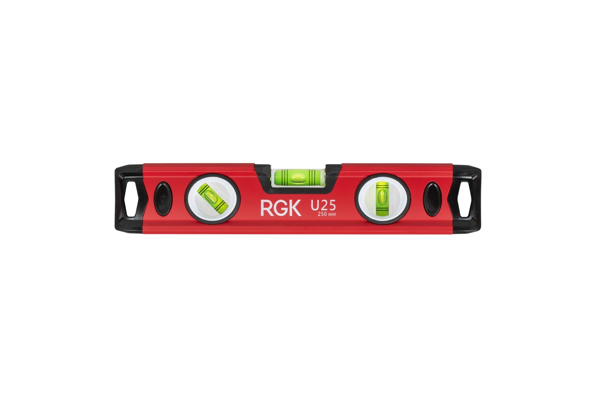 Конструкция пузырькового уровня RGK U25 предполагает наличие надежного металлического корпуса и акриловых ампул с жидкостью. Жидкость всегда стремится занять горизонтальное положение, поэтому пузырек воздуха оказывается наверху. Если он располагается между специальными метками, можно говорить о том, что поверхность абсолютно ровная.