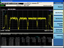 - Измерения спектра: измерение мощности в канале, мощности в соседнем канале (ACP), паразитных излучений передатчика, проверка спектральной маски излучения (SEM) на соответствие требованиям стандарта 3GPP по критерию «Годен/Не годен»