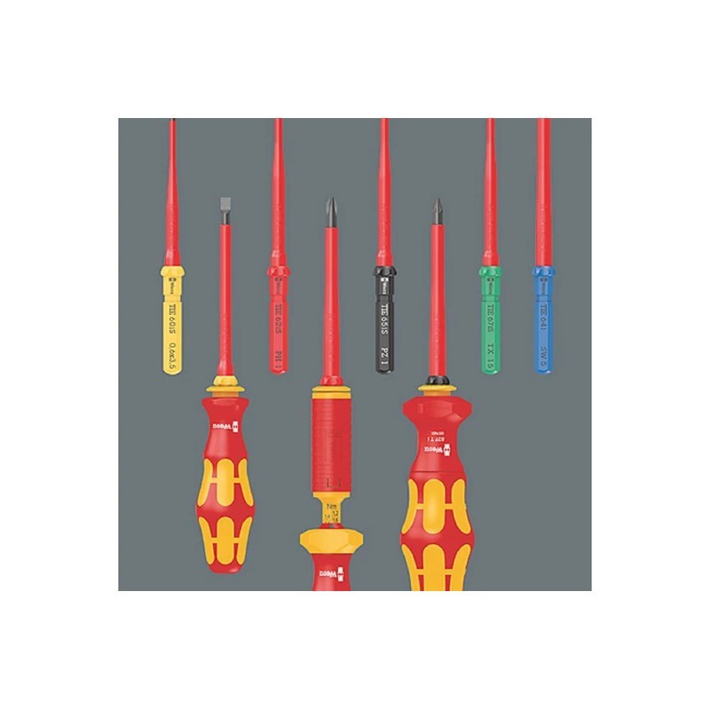 Сменная отвёртка VDE для системы "Одна ручка - много насадок" Kraftform Kompakt. Комбинированный профиль "шлиц/Pozidriv*", прежде всего для работы с клеммными колодками, предохранительными коробками, переключателями, реле. Моментальная смена насадок без специального инструмента. Насадки проверены поштучно по стандарту IEC 60900. Поштучная проверка под напряжением 10000 В для безопасной работы на оборудовании с допустимым напряжением 1000 В. Наконечник Black Point марки Wera обеспечивает точность работы и оптимальную защиту от коррозии. С идентификатором инструментов Take it easy: цветовая кодировка профиля и лазерная гравировка размера. Шестигранные края стержня предотвращают случайное скатывание отвёртки на рабочем месте. |