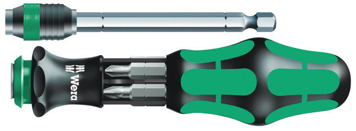 Компактные инструменты Wera подходят одновременно для завинчивания как в ручном, так и машинном режимах. Система "Одна ручка – много насадок" компактной конструкции с рабочими концами разных профилей, размещенная в компактном футляре, делает работу мобильной и гибкой. Подходит для битов с шестигранным хвостовиком 1/4" по стандарту DIN ISO 1173-C 6,3 и E 6,3 (ISO 1173) и с типами хвостовика Wera 1 и 4. С переходником, выдвижным стержнем, патроном Rapidaptor. Многокомпонентная ручка Kraftform с защитой от перекатывания, для особенно эргономичного завинчивания. Встроенный магазин для хранения битов. Данный набор заменяет набор из шести отверток и снижает до минимума необходимый комплект. Утапливаемый в ручке выдвижной стержень с быстрозажимным патроном позволяет легко обращаться с инструментом даже в тесном пространстве, если стержень не выдвинут. Рабочий стержень легко выдвигается простым нажатием на стопорное кольцо. После этого ручку-держатель можно использовать как полноценную отвёртку. Выдвижной стержень можно извлечь и использовать в качестве адаптера с машинным приводом или вернуть в исходное положение.