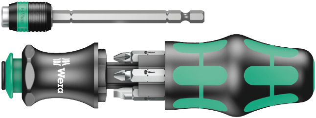 Компактные инструменты Wera подходят одновременно для завинчивания как в ручном, так и машинном режимах. Система "Одна ручка – много насадок" компактной конструкции с рабочими концами разных профилей, размещенная в компактном футляре, делает работу мобильной и гибкой. Подходит для битов с шестигранным хвостовиком 1/4" по стандарту DIN ISO 1173-C 6,3 и E 6,3 (ISO 1173) и с типами хвостовика Wera 1 и 4. С переходником, выдвижным стержнем, патроном Rapidaptor. Многокомпонентная ручка Kraftform с защитой от перекатывания, для особенно эргономичного завинчивания. Встроенный магазин для хранения битов. Данный набор заменяет набор из шести отверток и снижает до минимума необходимый комплект. Утапливаемый в ручке выдвижной стержень с быстрозажимным патроном позволяет легко обращаться с инструментом даже в тесном пространстве, если стержень не выдвинут. Рабочий стержень легко выдвигается простым нажатием на стопорное кольцо. После этого ручку-держатель можно использовать как полноценную отвёртку. Выдвижной стержень можно извлечь и использовать в качестве адаптера с машинным приводом или вернуть в исходное положение. В практичной поясной сумке.